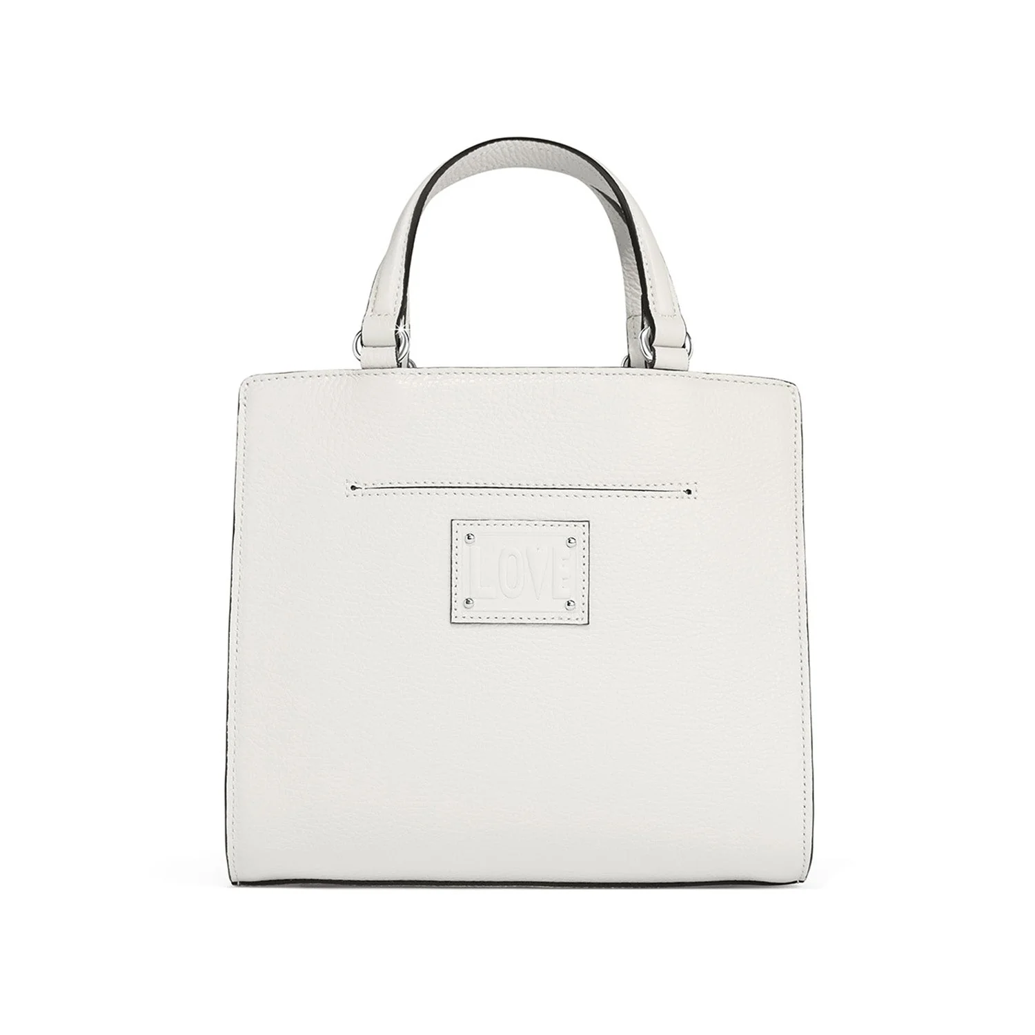 This small fashionable hand-held tote is crafted of fine Italian pebbled leather with a detachable crossbody strap. She has chic little handles, a center zip compartment for useful organization, and a convenient back slip pocket. The hardware is impressive – there are 13 puffed metal hearts, 2 different sizes of nailheads, luxe quilted leather and trapunto (dimensional bump) banding encircling the bag.